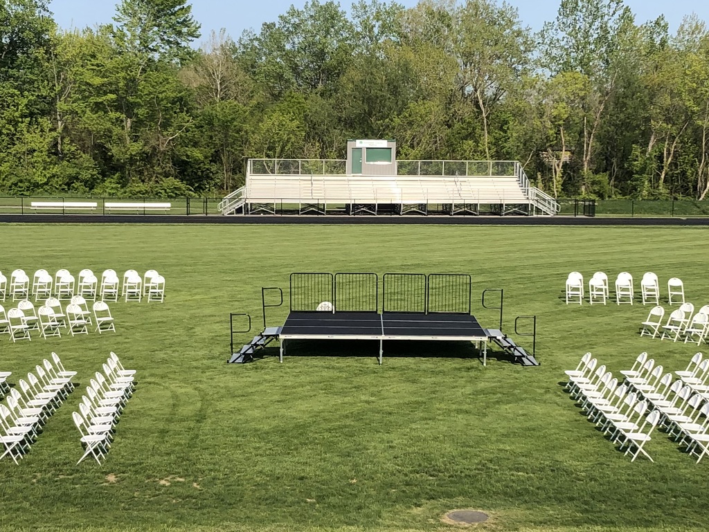 Our staging is available in 4'x8' sections. You can rent a single section or multiple sections together to create a larger area. Staging can be at ground level or raised. Stairs, handrails, and back railing are also available.